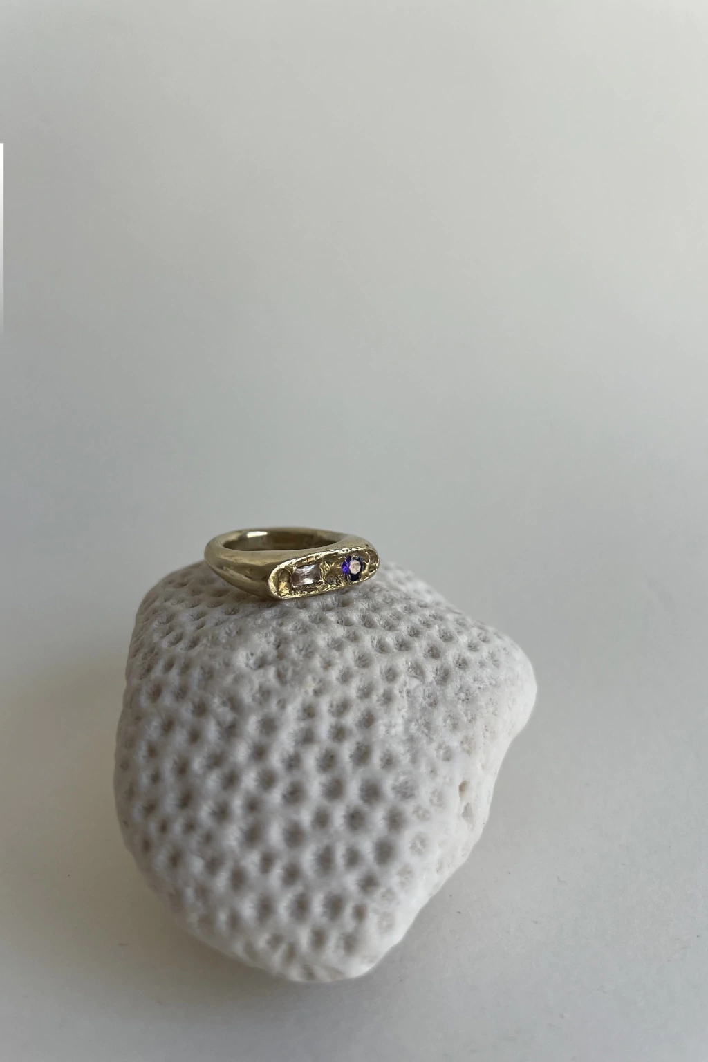 Anillo artesanal en bronce, tiene dos zircones engarzados.